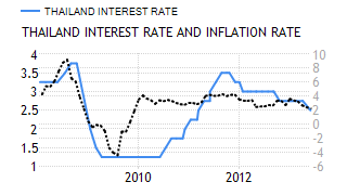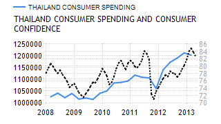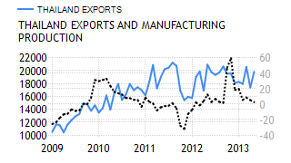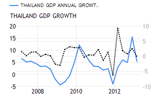 In Q1 of 2013, the GDP growth slowed to 5.3 percent yoy, from 19.1 percent in the previous quarter. Domestic demand remained the main driver of the expansion while exports have been hurt by a strong baht. On a quarter-over-quarter basis, the GDP shrank by 2.2 percent. |